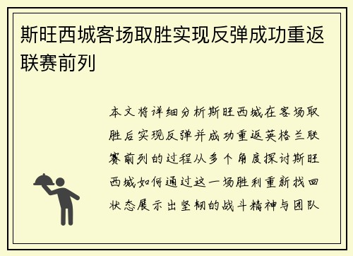 本文将详细分析斯旺西城在客场取胜后实现反弹并成功重返英格兰联赛前列的过程。从多个角度探讨斯旺西城如何通过这一场胜利重新找回状态,展示出坚韧的战斗精神与团队协作。文章将从以下几个方面展开:首先是球队整体表现的提升,其次是战术调整和教练策略的成功实施,再者是球员个人的出色发挥,最后是客场获胜对球队士气的积极影响。通过这些层面的探讨,本文将全面展示斯旺西城如何利用一场关键的客场胜利,重塑信心并顺利回归联赛前列。