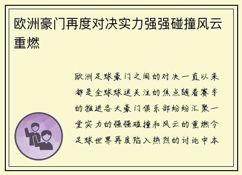 欧洲豪门再度对决实力强强碰撞风云重燃