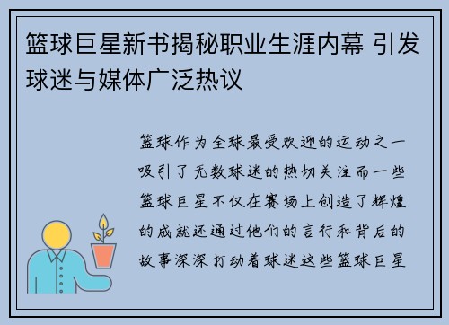篮球巨星新书揭秘职业生涯内幕 引发球迷与媒体广泛热议