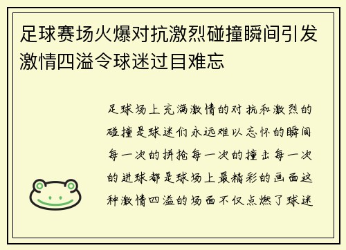 足球赛场火爆对抗激烈碰撞瞬间引发激情四溢令球迷过目难忘