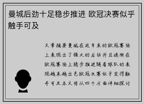 曼城在近年来的欧冠赛场上表现出了强大的后劲,并且逐渐在欧冠赛场上稳步推进。随着球队的表现越来越出色,欧冠决赛似乎变得触手可及。本文将从四个方面详细探讨曼城如何凭借其后劲稳步推进,最终在欧冠赛场上取得突破。首先,曼城的球队建设和战术进步,为他们在欧冠赛场上打下了坚实基础;其次,球员个人能力的提升以及团队默契的增强,也让曼城在面对强敌时能够从容应对;再次,主帅瓜迪奥拉的战术调整和细致安排,让曼城在关键时刻能够把握机会,发挥出最强战斗力;最后,曼城对欧冠目标的坚定信念以及不懈追求,让他们即使在困难时刻也能够保持冷静和坚持。通过这四个方面的阐述,我们可以清晰地看到曼城如何一步步接近欧冠决赛,并为最终的成功奠定基础。