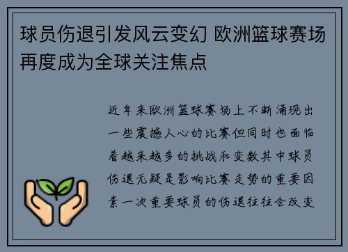 球员伤退引发风云变幻 欧洲篮球赛场再度成为全球关注焦点